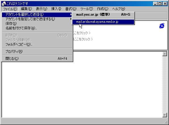 メールを書いた後、標準に設定したメールアドレスをつけて送信する場合は通常の「送信ボタン」を押してください. アカウントを選択したい場合は 「ファイル」−−>「アカウントを選択して送信」−−>加入プロバイダもしくは県医師会のアカウントを選択.